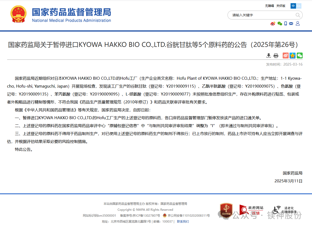 近日,國(guó)家藥監(jiān)局發(fā)布重要公告,宣布暫停進(jìn)口日本KYOWA HAKKO BIO CO.,LTD.(協(xié)和發(fā)酵株式會(huì)社)生產(chǎn)的谷胱甘肽等5個(gè)原料藥。這一決定源于該公司的Hofu工廠在生產(chǎn)過程中存在未按批準(zhǔn)信息組織生產(chǎn)、外購(gòu)原料藥進(jìn)行貼簽、包裝或外購(gòu)粗品進(jìn)行精制等嚴(yán)重違規(guī)行為,不符合我國(guó)《藥品生產(chǎn)質(zhì)量管理規(guī)范(2010年修訂)》及相關(guān)審評(píng)審批要求。為確保藥品安全與質(zhì)量,國(guó)家藥監(jiān)局已暫停上述原料藥的進(jìn)口,并對(duì)其在藥品制劑中的使用進(jìn)行了嚴(yán)格限制。