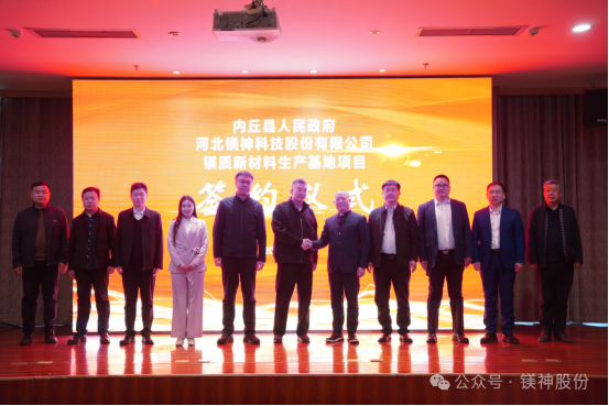 2025年3月28日,河北鎂神科技股份有限公司與內(nèi)丘縣人民政府在阿爾卡迪亞酒店悅盛廳隆重舉行鎂質(zhì)新材料生產(chǎn)基地項(xiàng)目簽約儀式。該項(xiàng)目總投資20.25億元,選址邢臺(tái)市內(nèi)丘縣工業(yè)園區(qū),致力打造世界級(jí)高端鎂質(zhì)新材料生產(chǎn)基地,為區(qū)域經(jīng)濟(jì)高質(zhì)量發(fā)展注入新動(dòng)能。