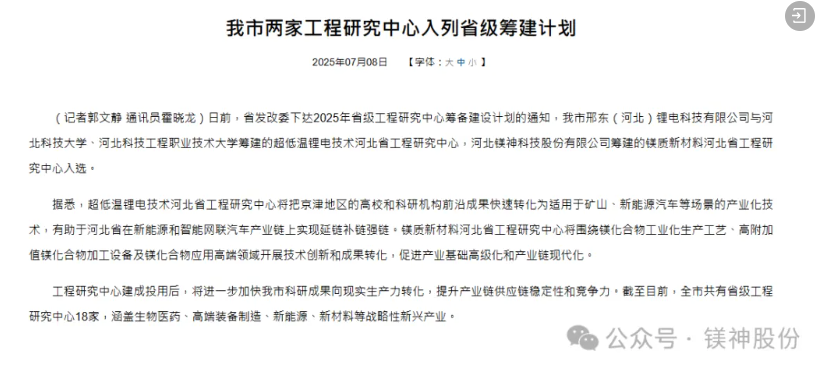 2025年7月8日,河北省發(fā)展和改革委員會正式公布了新一批河北省工程研究中心籌建計劃入選名單。由河北鎂神科技有限公司(簡稱:鎂神科技)牽頭籌建的“鎂質(zhì)新材料河北省工程研究中心”經(jīng)過嚴格遴選和專家評審,成功獲批立項,正式列入省級工程研究中心籌建計劃名單!這是鎂神科技發(fā)展歷程上的又一重要里程碑,也是河北省對我公司在鎂質(zhì)新材料領(lǐng)域創(chuàng)新能力與發(fā)展?jié)摿Φ母叨日J可!