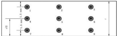 6.10.3.2 鋼板的硬度試驗(yàn),應(yīng)在寬度四分之一處取樣,經(jīng)拋光后按照 GB/T4340.1   測(cè)定維氏硬度 HV10,質(zhì)量證明書(shū)注明平均值,但單值應(yīng)不超過(guò)標(biāo)準(zhǔn)規(guī)定的允許值。測(cè)定點(diǎn)位置如圖 1 所示,硬度試 驗(yàn)點(diǎn)至少為9 點(diǎn) 。
