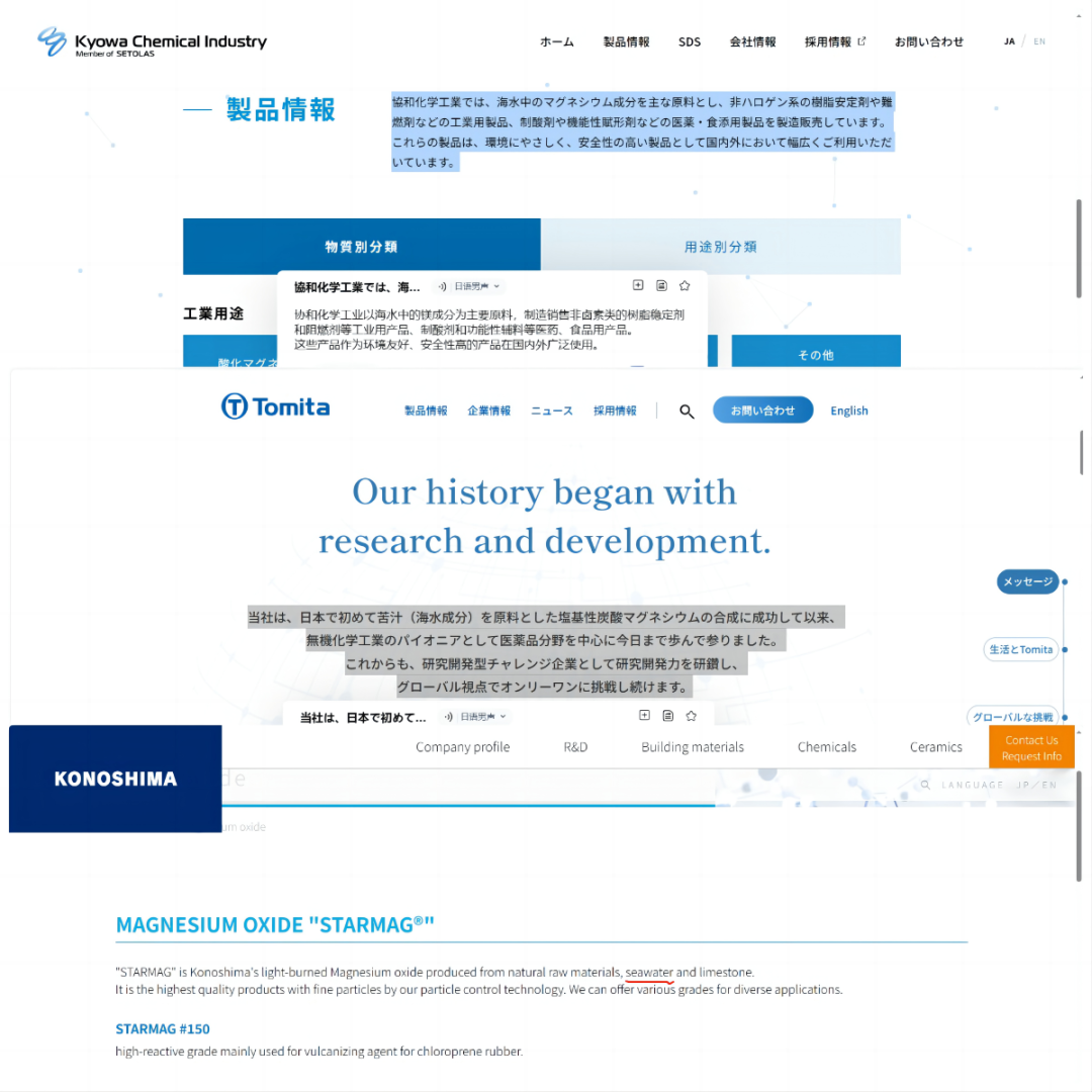 圖為相關(guān)日本公司官網(wǎng)將海水法制鎂鹽作為宣傳